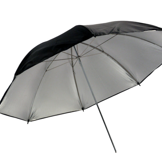 A 45" reflective umbrella with soft silver interior and black backing. It intensifies light as it reflects it and creates specular highlights.