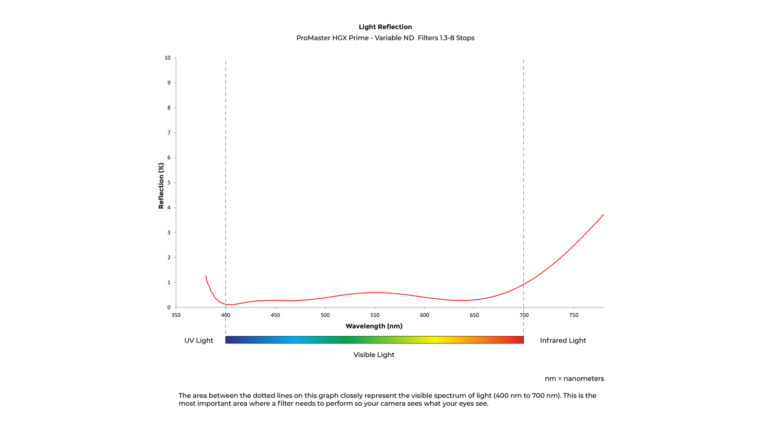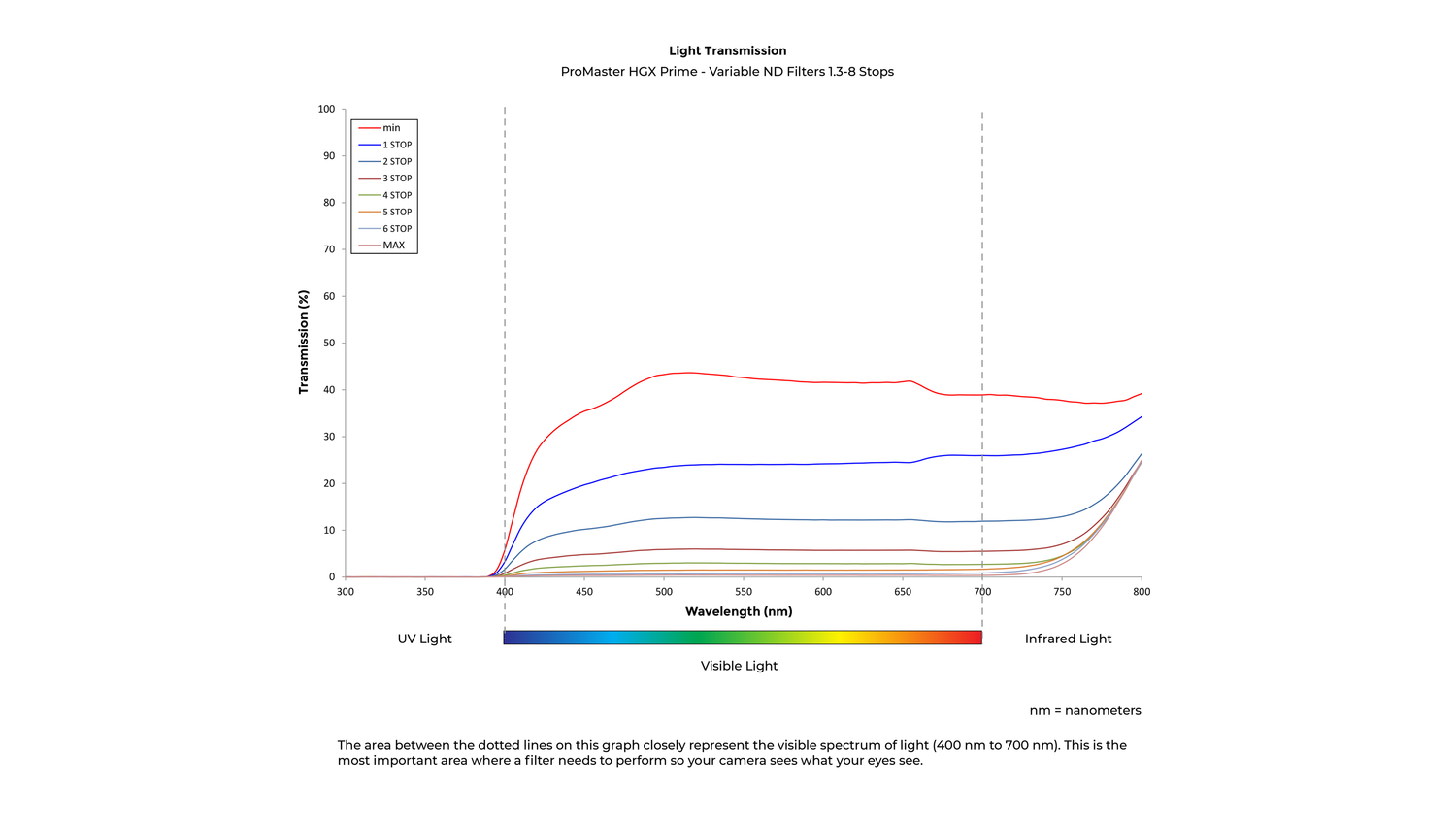 HGX Prime VND filters provide an exposure reduction of 1.3 to 8 stops (ND 2.5-256 equivalent).