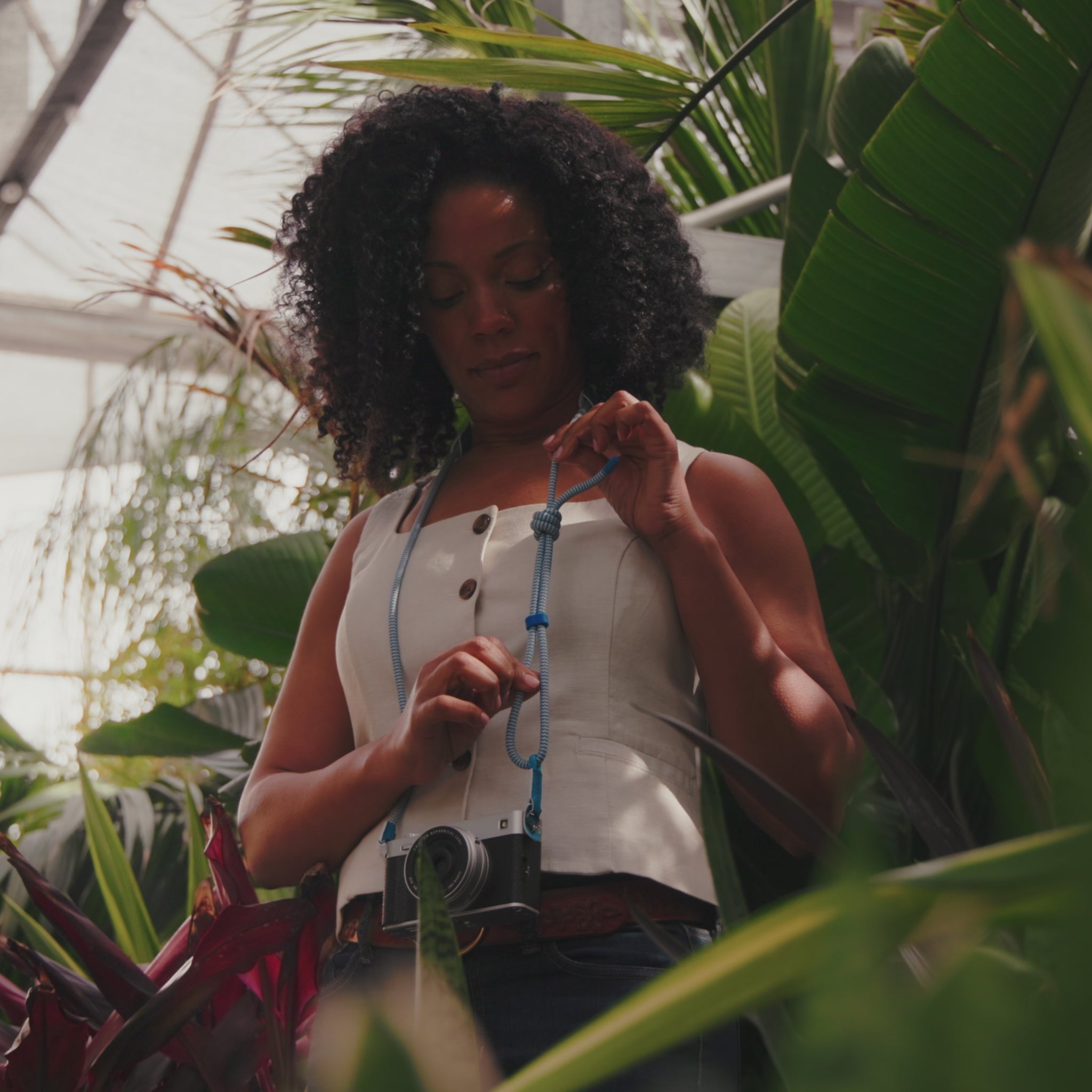 Stylish and versatile with an adjustable length, this light blue rope strap is a great way to carry your camera.