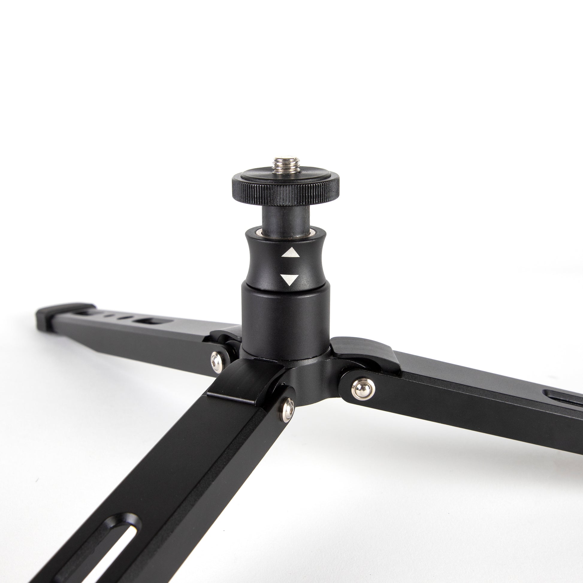 Use the 3-leg base for the best stability. A ball joint is built into the 3-leg base which allows the monopod to pan and tilt. This ball joint can be locked so the unit will not tilt but can still pan. The legs of the base can be folded-up for easy transport. A soft foot is attached to the bottom of the 3-leg base for use when the legs are folded. Additionally, the soft foot can be installed directly on to the monopod when the 3-leg base is removed. This creates a smaller, lighter rig with a more traditional, single-foot. The connection between the 3-leg base or soft foot and the bottom of the monopod is a robust 3/8"-16.