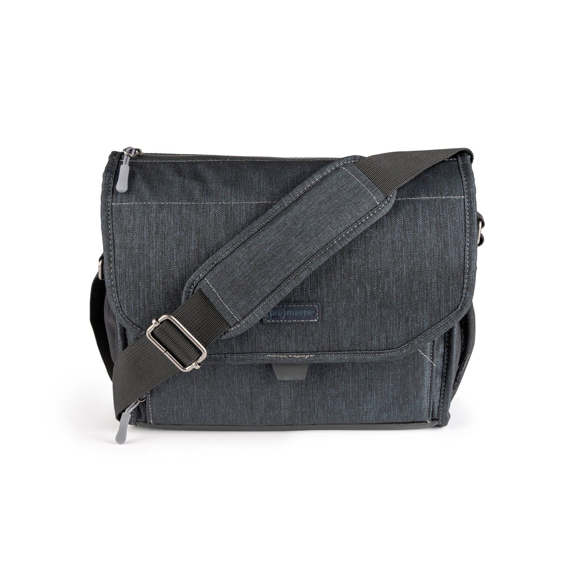 A beautiful, deep blue, over-the-shoulder camera bag with lots of storage space for its size, and a nifty magnetic latch. This large size bag can hold a mirrorless camera or DSLR with 1 to 4 lenses, speedlight, and accessories.