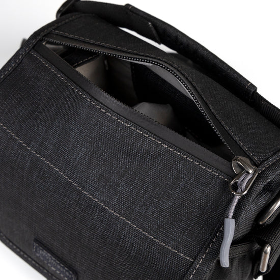 The Blue Ridge series blends the lines of style and functionality quite well. Lots of storage space for its size, and a nifty magnetic latch for one hand to quickly open for access. Alternatively, unzip the top of the bag for direct access to the main camera compartment.