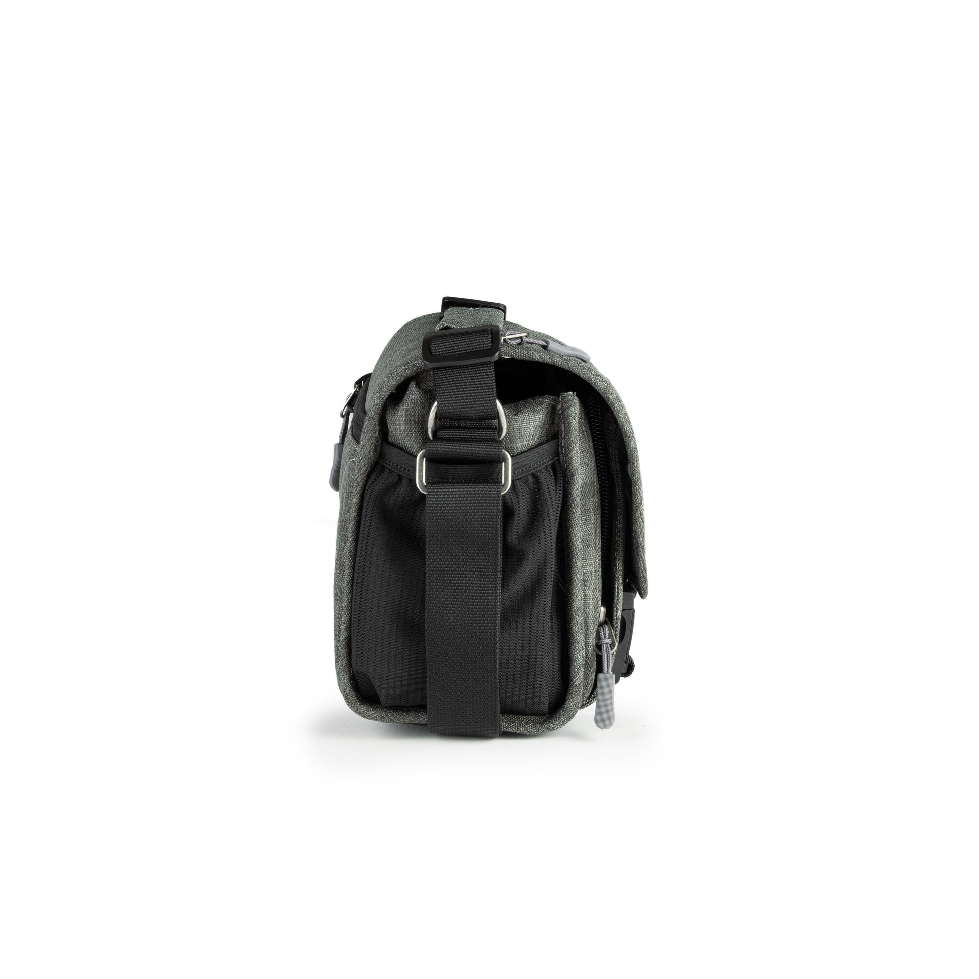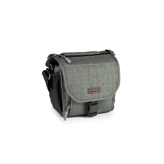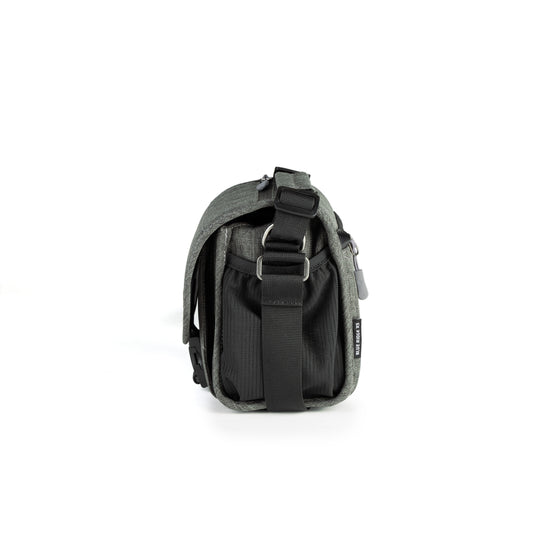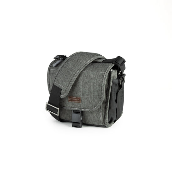 A beautiful, mottled green color, over-the-shoulder camera bag with lots of storage space for its size, and a nifty magnetic latch. This extra small size bag can hold a point-n-shoot or small mirrorless camera with 1 or 2 small lenses and accessories.