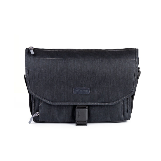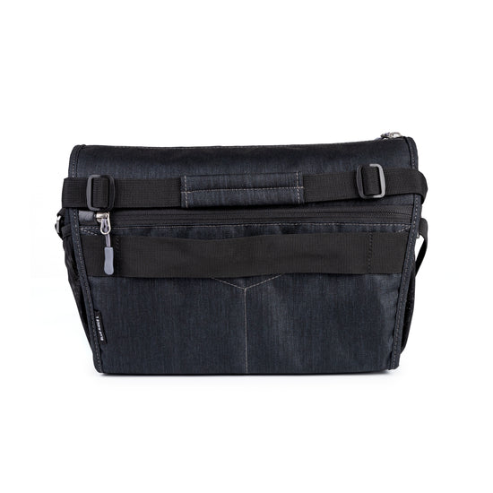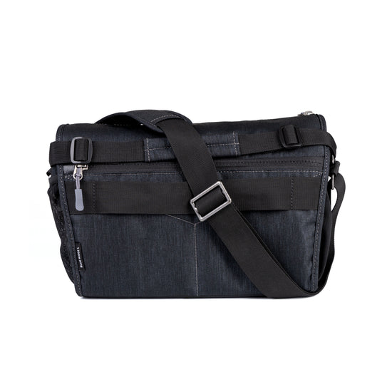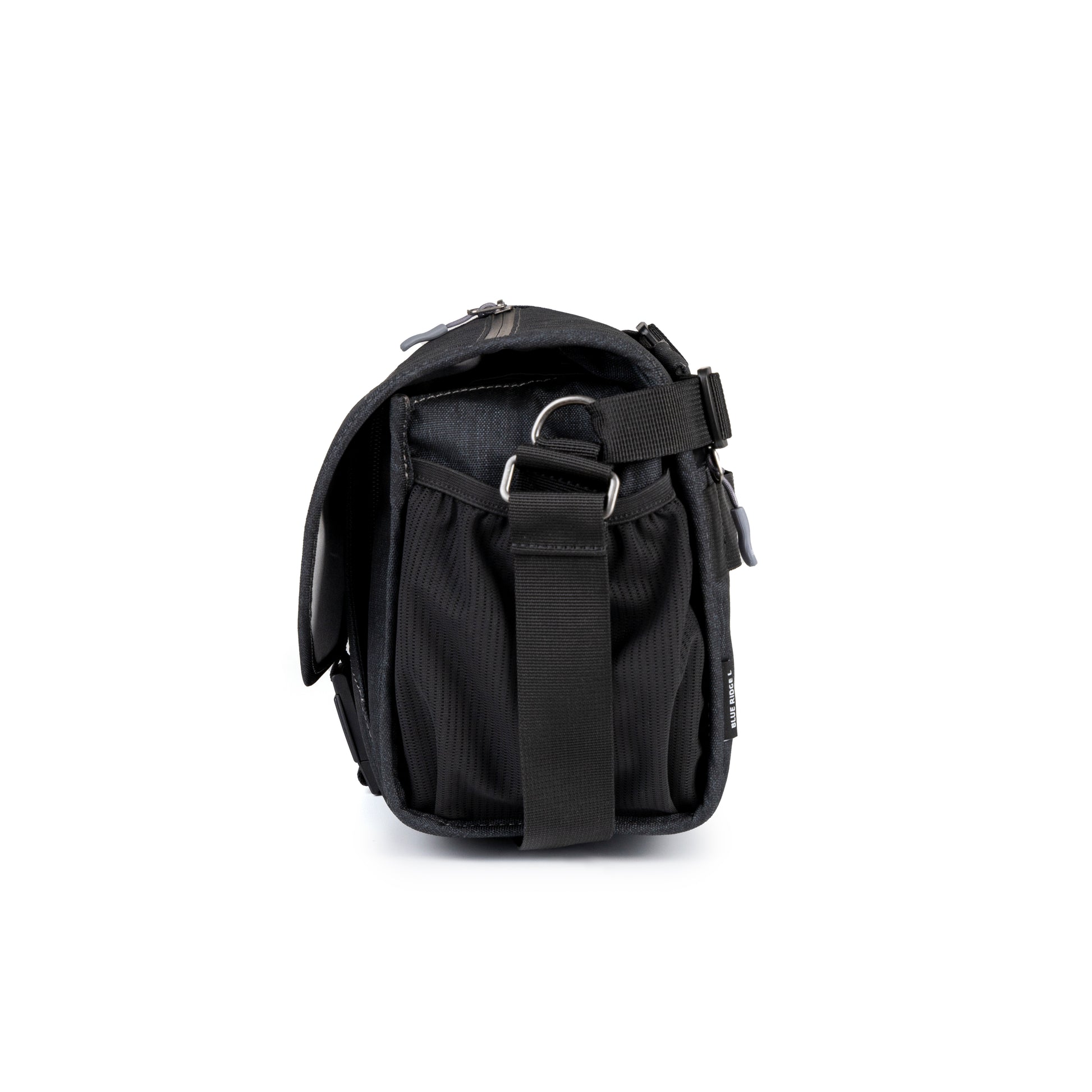 A beautiful, deep blue, over-the-shoulder camera bag with lots of storage space for its size, and a nifty magnetic latch. This large size bag can hold a mirrorless camera or DSLR with 1 to 4 lenses, speedlight, and accessories.