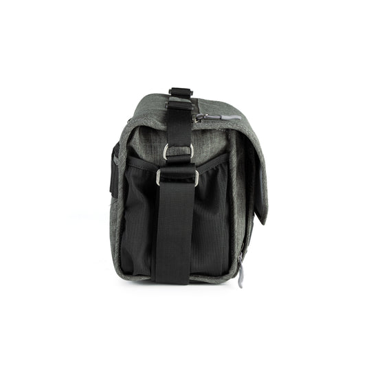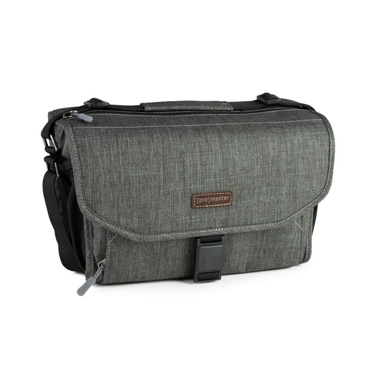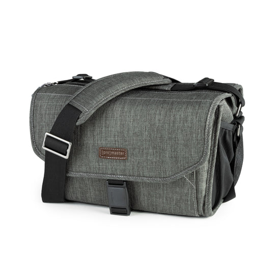 A beautiful, mottled green color, over-the-shoulder camera bag with lots of storage space for its size, and a nifty magnetic latch. This large size bag can hold a mirrorless camera or DSLR with 1 to 4 lenses, speedlight, and accessories.