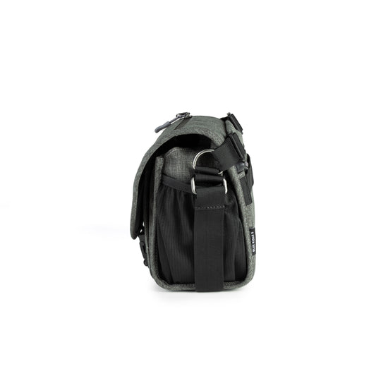 A beautiful, mottled green color, over-the-shoulder camera bag with lots of storage space for its size, and a nifty magnetic latch. This small size bag can hold a small mirrorless or DSLR camera with 1 or 2 lenses, speedlight, and accessories.