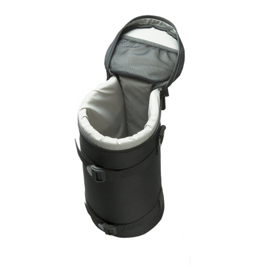 ProMaster's Deluxe Lens Case LC6 uses thick, semi-rigid foam padding to absorb bumps and bruises. The lid features an overlapping zipper to help keep dirt and dust out. The outside of the lens case uses a durable, heavy duty cordura material while the inside is made of a smoother, gentler nylon that's easy on your lens. Two tension straps around the outside allow you to snug the case up for a close fit. You can attach the deluxe lens case to a belt or bag using the belt loop on the back of the case, which employs a hook and loop fastening system to open and close securely. Store your lens cap or filter in the convenient mesh pocket underneath the lid. This case also includes a shoulder strap and has two D-rings sewn-in to provide additional attachment points for the strap or to connect with other bag & harness systems.