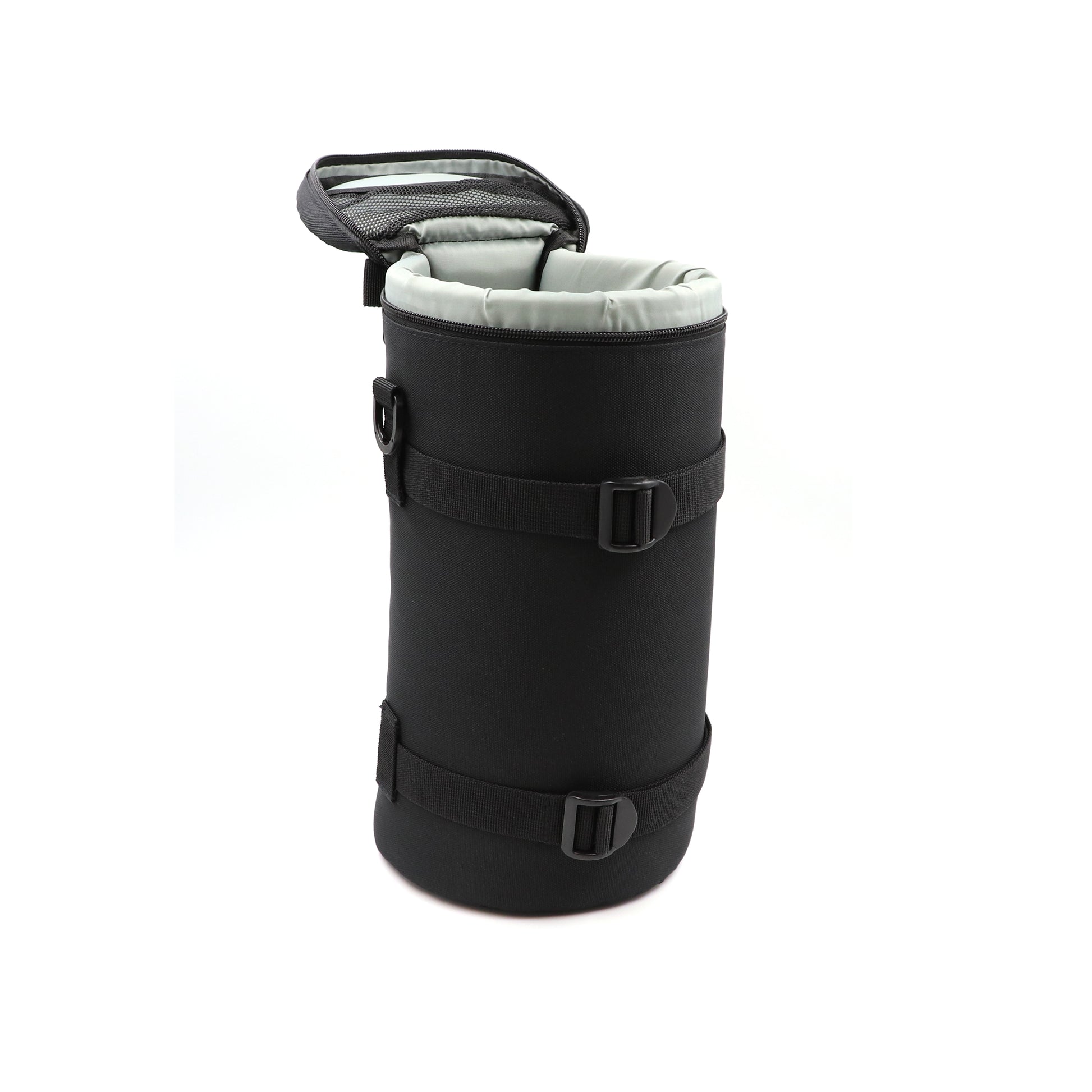 ProMaster's Deluxe Lens Case LC8 uses thick, semi-rigid foam padding to absorb bumps and bruises. The lid features an overlapping zipper to help keep dirt and dust out. The outside of the lens case uses a durable, heavy duty cordura material while the inside is made of a smoother, gentler nylon that's easy on your lens. Two tension straps around the outside allow you to snug the case up for a close fit. You can attach the deluxe lens case to a belt or bag using the belt loop on the back of the case, which employs a hook and loop fastening system to open and close securely. Store your lens cap or filter in the convenient mesh pocket underneath the lid. This case also includes a shoulder strap and has two D-rings sewn-in to provide additional attachment points for the strap or to connect with other bag & harness systems.