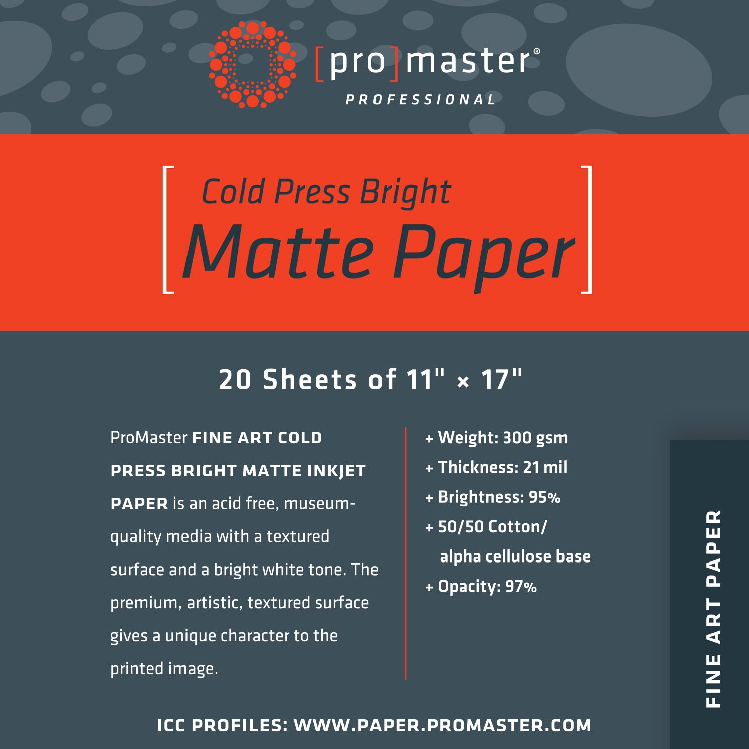 ProMaster Fine Art Cold Press Bright Matte Inkjet Paper is a textured, bright white inkjet media for creating brilliant, artistic prints.
