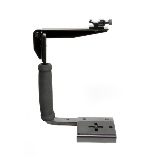 The ProMaster Flash Bracket 1 features a "quick flip" design that keeps the flash high and directly over the camera lens in both horizontal and vertical positions. This helps to eliminate red-eye and unwanted side shadows. The Flash Bracket 1 also sports an ultrasteady platform base that allows the user to stand the entire assembly (camera, flash and bracket) up for easier access and greater stability. The large base has more surface area making it ideal for larger cameras like medium format or digital SLR cameras.