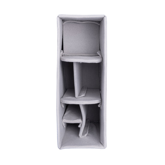 Inside you will find a light grey interior against which small items stand out, so they don't get lost at the bottom of the bag. The main compartment is customizable using movable dividers that provide cushioning. This main compartment is also removable so you can use the Jasper bag to carry other things, and/or you can drop the main camera compartment into a different bag. Behind the main camera compartment is a slender compartment for holding a tablet or flat accessories such as pop-up reflectors, exposure cards, etc…