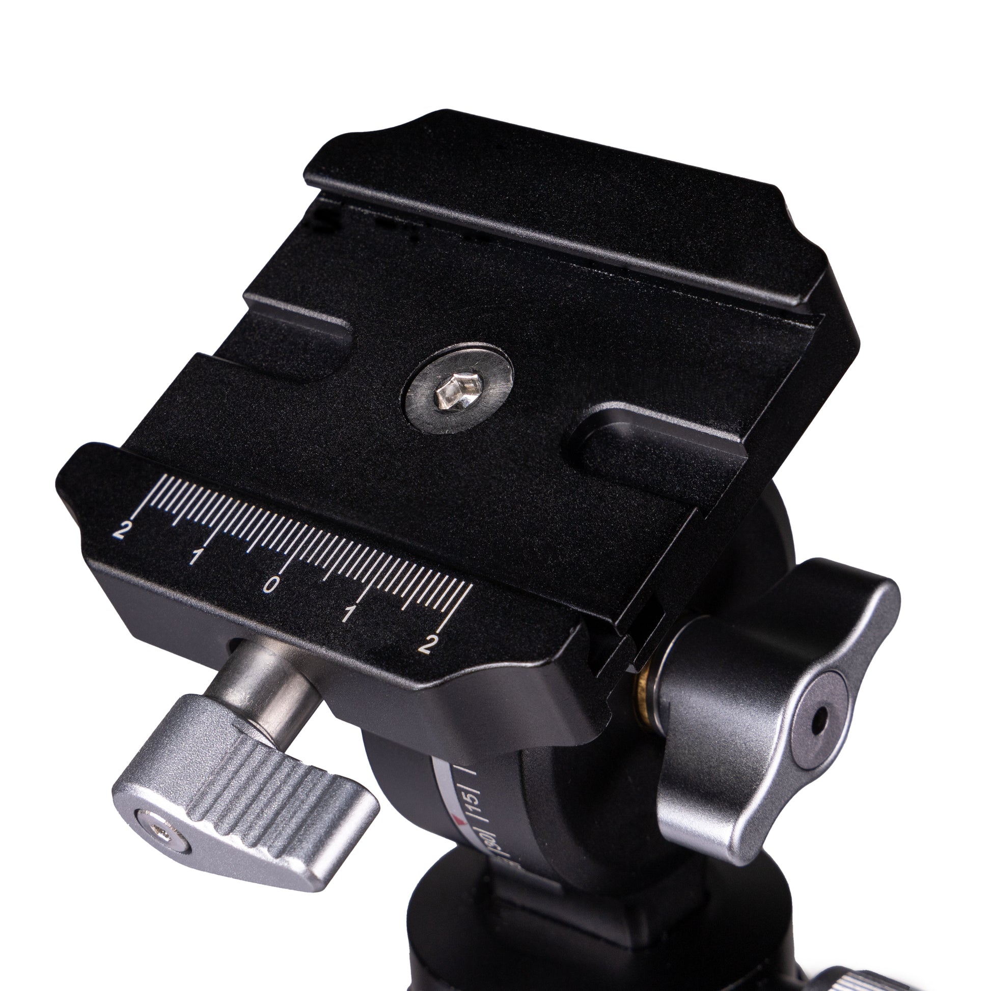 This head comes with the excellent 3398 Dovetail (arca-type) Quick Release Plate. This QR plate includes ¼”-20 and 3/8”-16 mounting bolts, both of which can be installed using either a flathead screwdriver or one of the two 4mm hex keys contained in the Key Grip’s handle. The plate also has a removable spring-loaded anti-twist pin. The QR plate is over 101mm long, making it easy to properly balance a camera rig. A scale on the QR platform lets you quickly repeat any given setup. The QR platform is also repositionable and can be changed from front-to-back to a side-to-side sliding direction! This is particularly useful for mounting a camera with a cage or L-bracket attached. The plate uses a safety bolt design to prevent a camera from accidentally sliding off the head’s platform, and its Dovetail connection is compatible with a wide variety of plates and accessories from ProMaster and other brands.