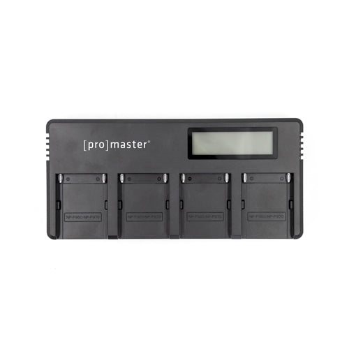 The quad charger has a convenient LCD screen to display approximate charge levels for each battery. It will automatically recognize an NP-F type battery inserted into any one of its 4 slots. It is compatible with Sony and ProMaster NP-F batteries as well as a wide variety other brands and capacities of NP-F type batteries.