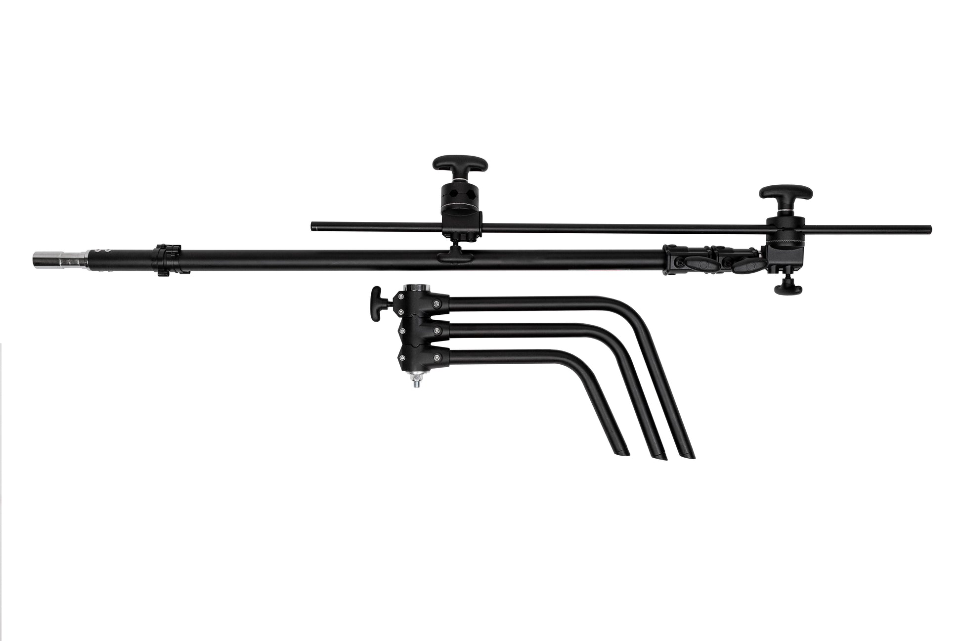 A professional 10.9' black, steel C-Stand kit with removable turtle base, 40” extension arm, and 2 - 2.5” grip heads.