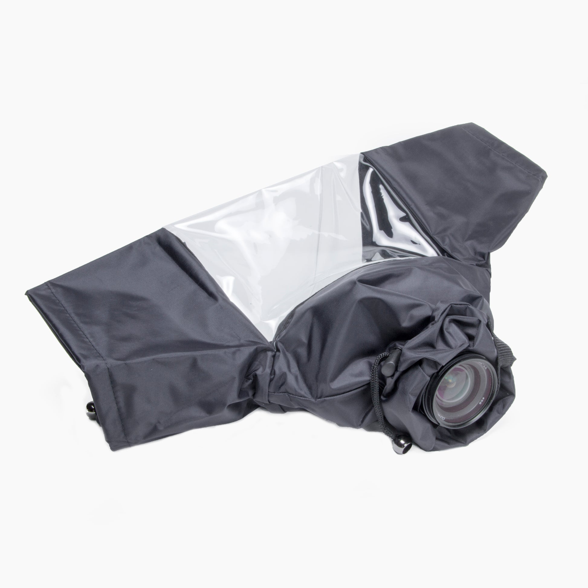 This Rain Jacket folds-down to an extremely compact size. Keep one in your camera bag at all times and be ready for inclement weather and tough conditions. The rain jacket’s wide bottom zipper makes it easy to install your camera. Because it uses a two-zipper design it is easy to close around a tripod or monopod with your camera mounted. The front of the jacket uses a cinch cord to close tight around your lens hood. And the two arm sleeves feature cinch cords to help keep water and dirt out while give you full access to camera and lens controls. A huge transparent window lets you see the cameras LCD screen and controls.