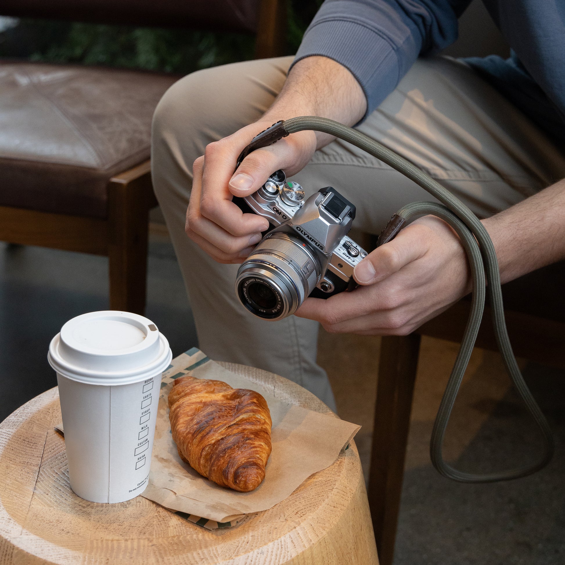 Simple and elegant in olive green with coffee-brown accents, with a special weave designed for comfort.
