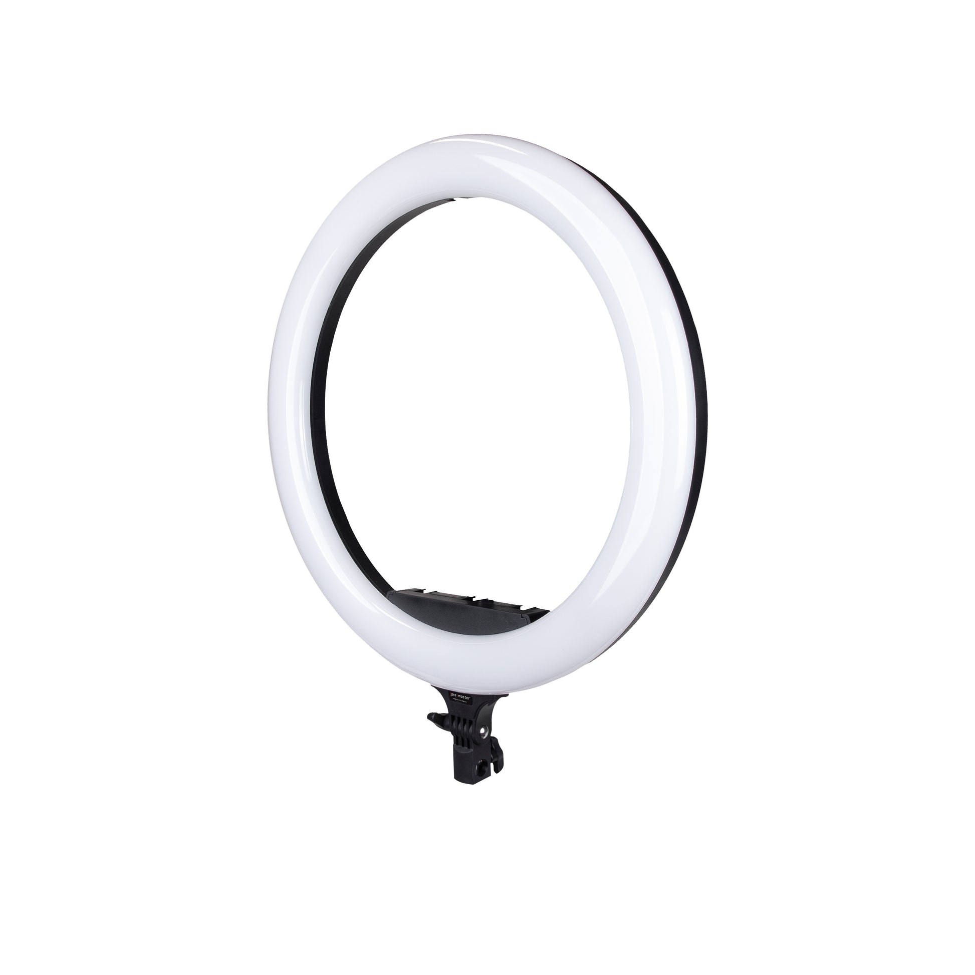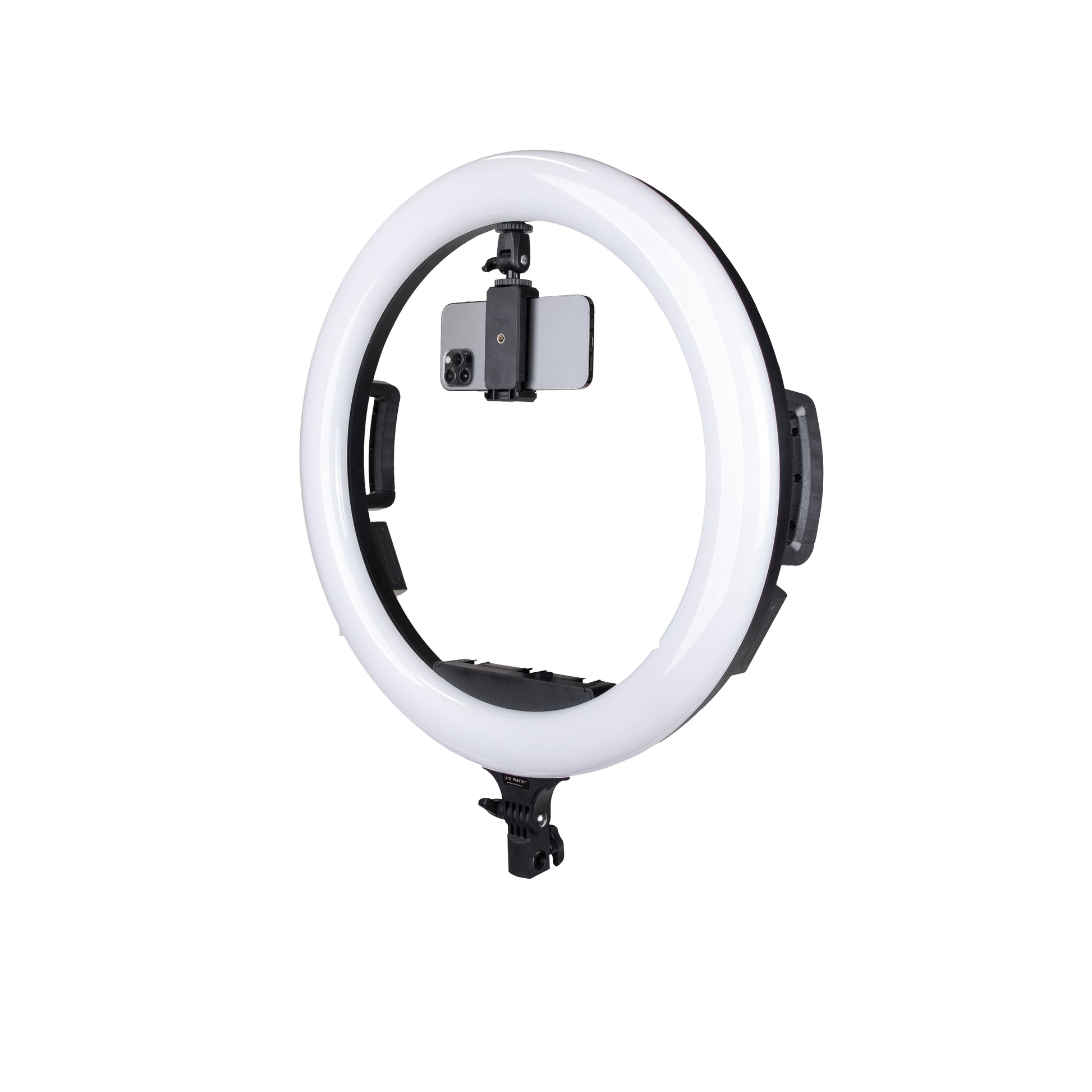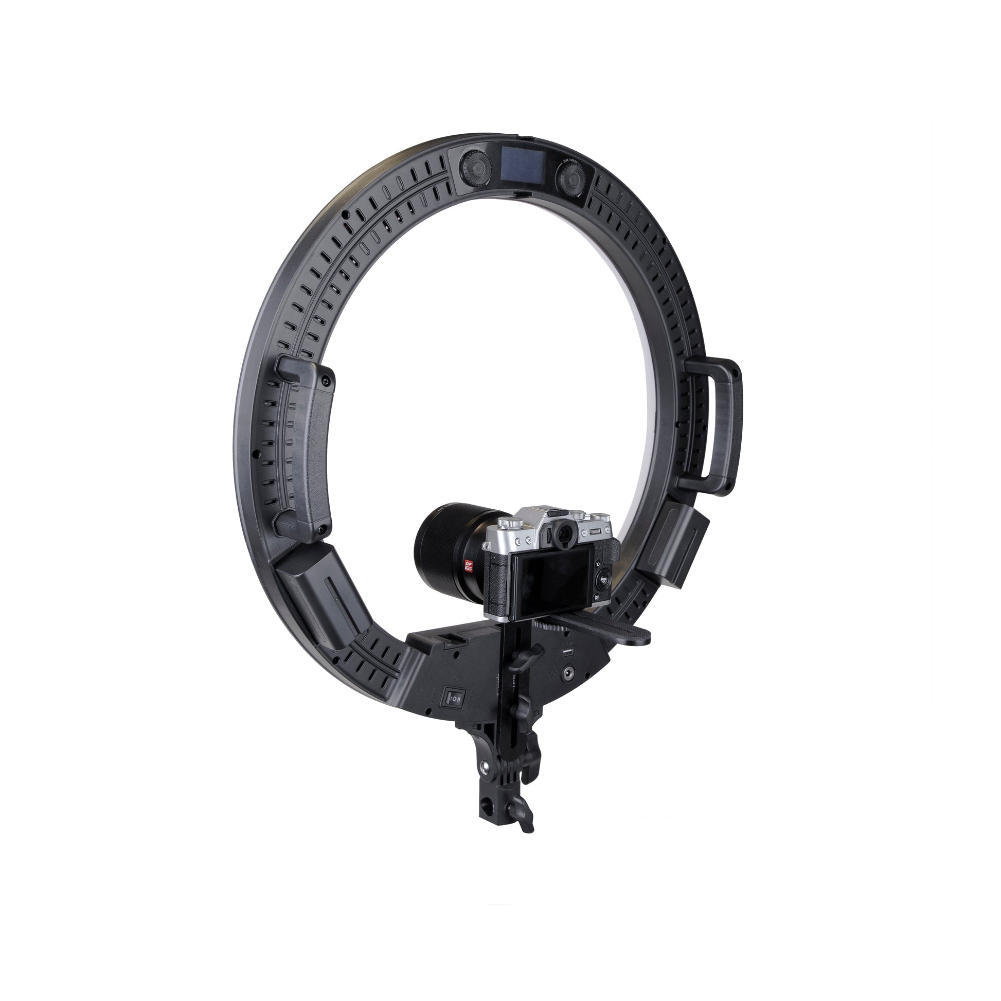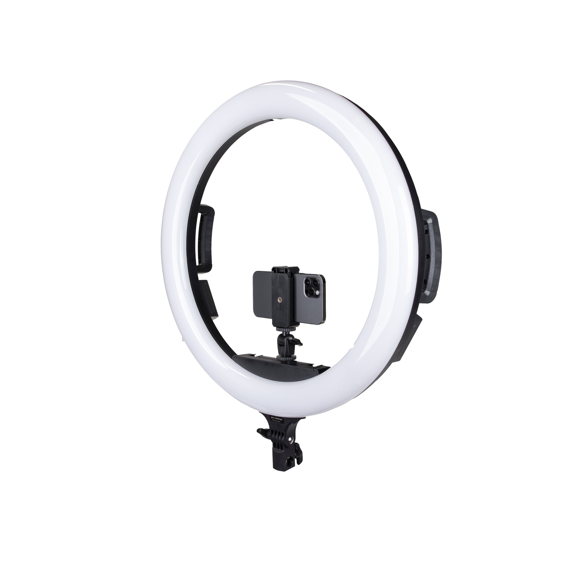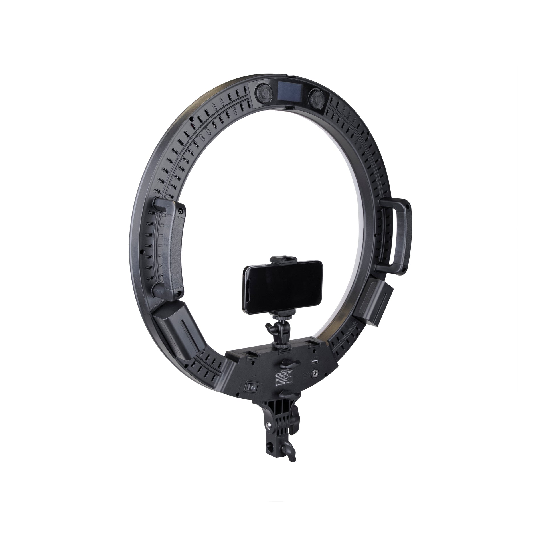 A large ringlight for cameras and smartphones featuring 360 colors, adjustable brightness & saturation, bi-color mode, and special effects.