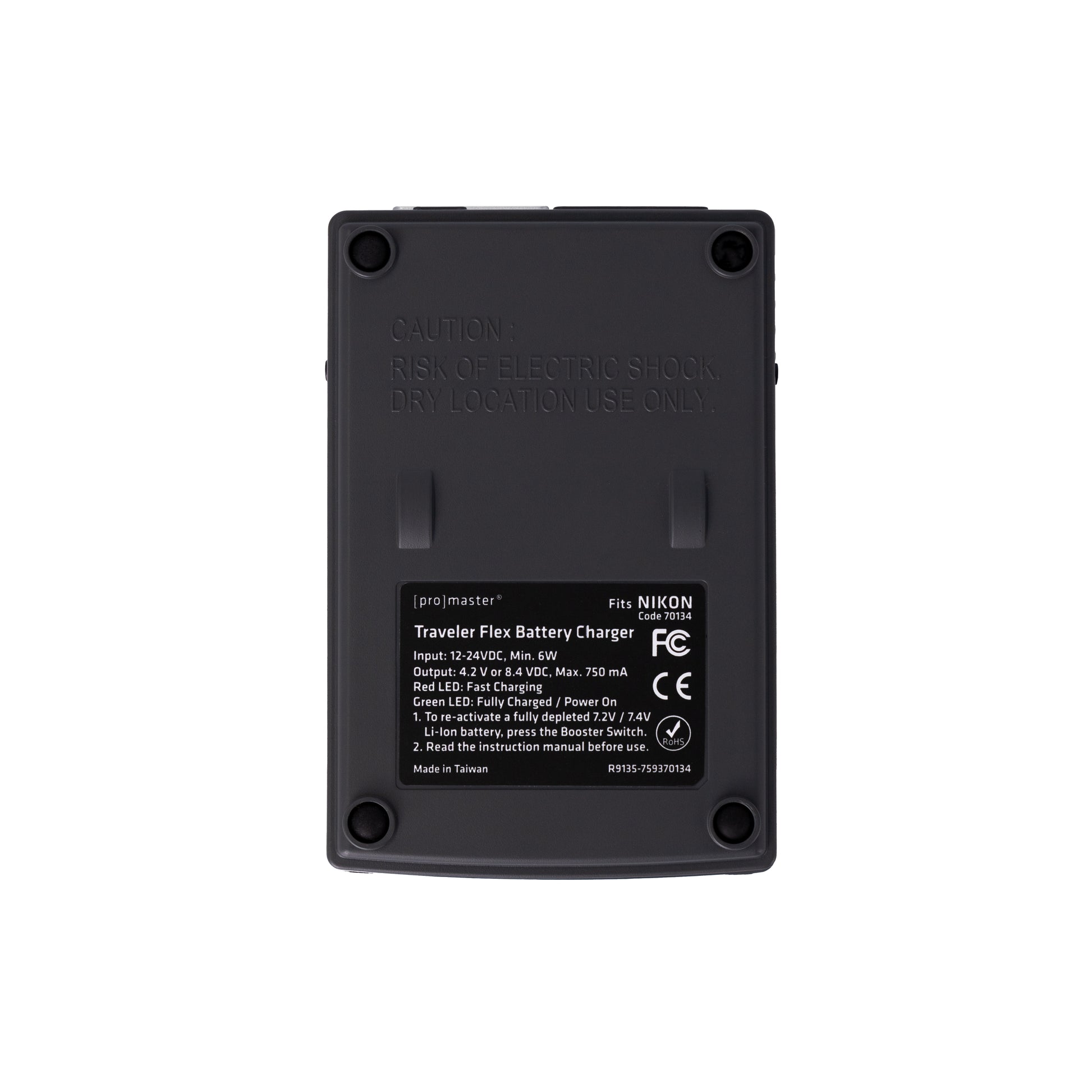 The ProMaster Traveler Flex Lithium-Ion Battery Charger is compact, lightweight, and easy to use: just plug it in and charge your battery. A convenient LED light turns red when your battery is charging and green when charging is complete. True to its name, the Traveler Flex is a great travel solution and has multi-voltage circuitry that accepts 120-240V for worldwide use with the included AC adapter (an outlet adapter is required for use in some countries). The Traveler Flex charges most batteries in two hours or less, and can be positioned flat on a desk or tabletop so that your batteries remain securely in place while charging.