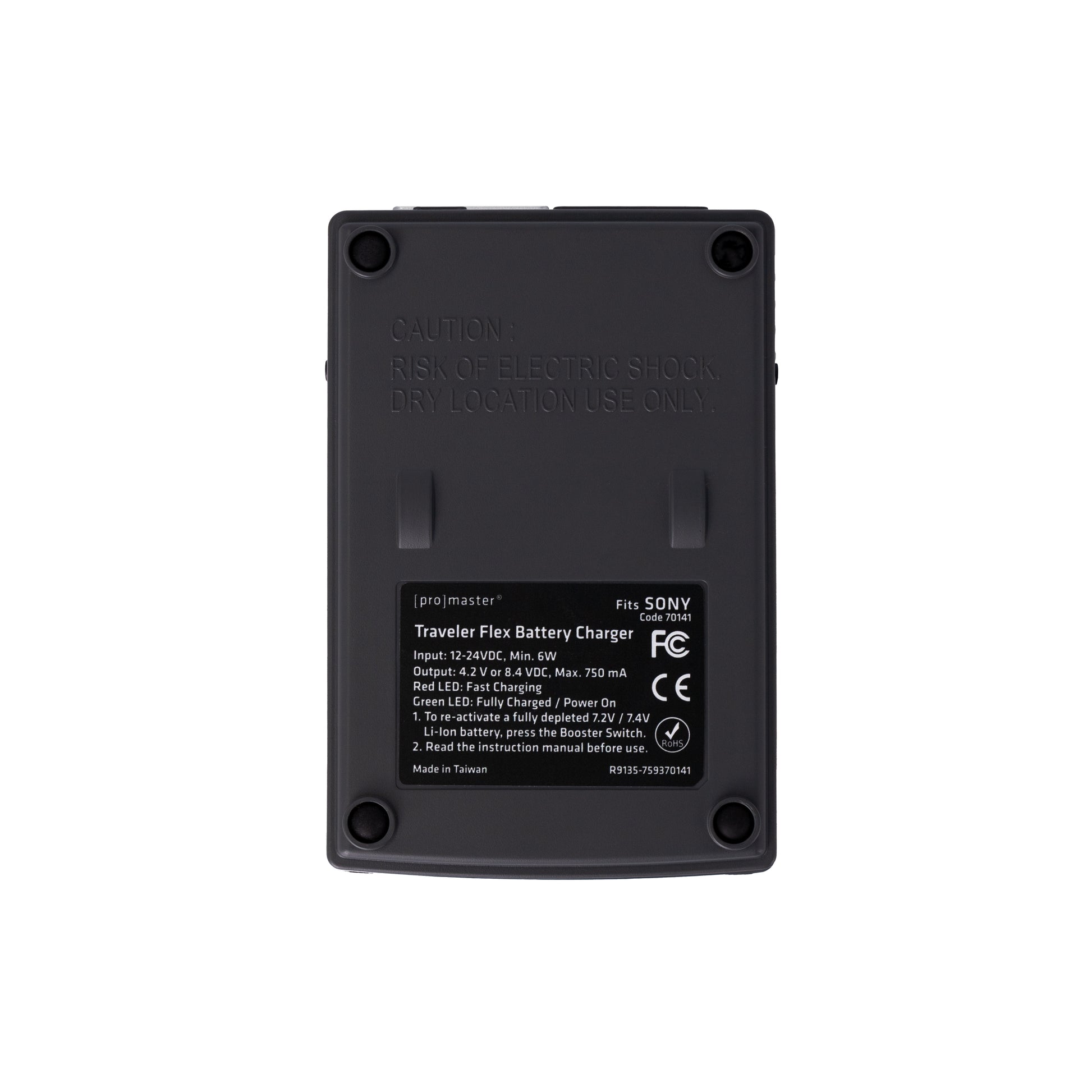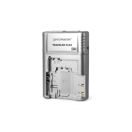 The ProMaster Traveler Flex Lithium-Ion Battery Charger is compact, lightweight, and easy to use: just plug it in and charge your battery. A convenient LED light turns red when your battery is charging and green when charging is complete. True to its name, the Traveler Flex is a great travel solution and has multi-voltage circuitry that accepts 120-240V for worldwide use with the included AC adapter (an outlet adapter is required for use in some countries). The Traveler Flex charges most batteries in two hours or less, and can be positioned flat on a desk or tabletop so that your batteries remain securely in place while charging.