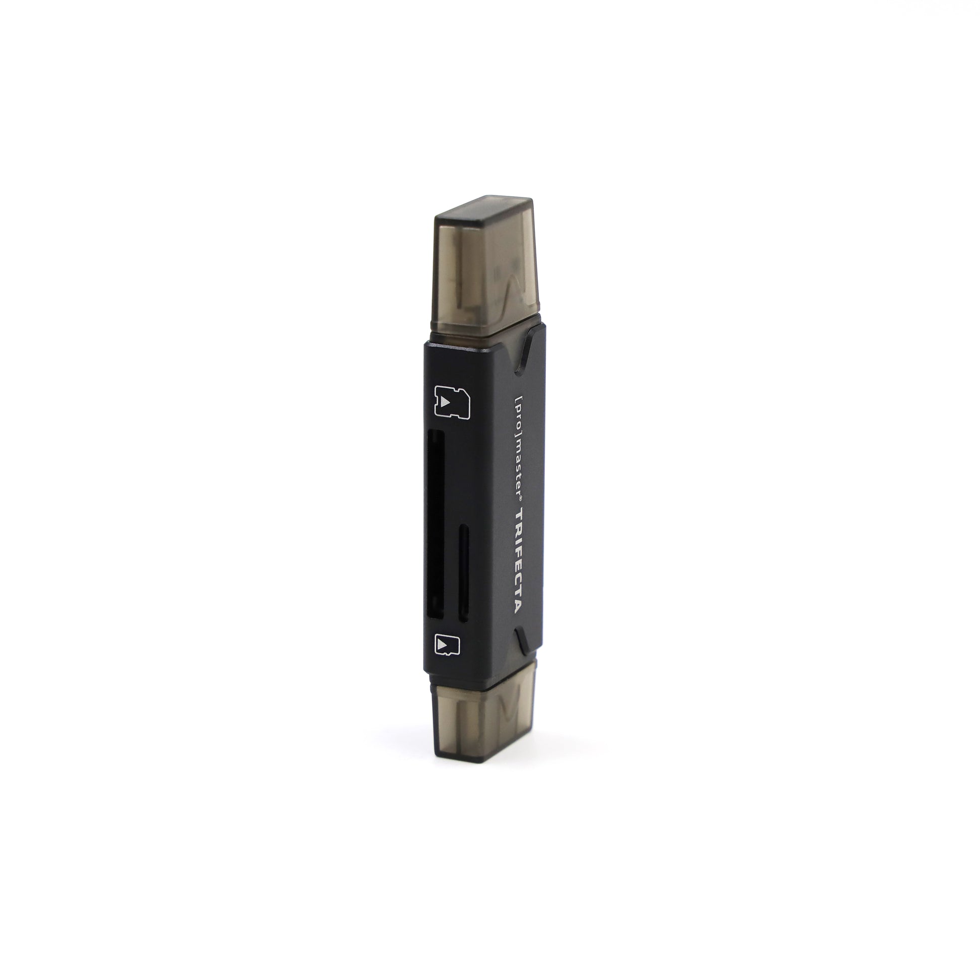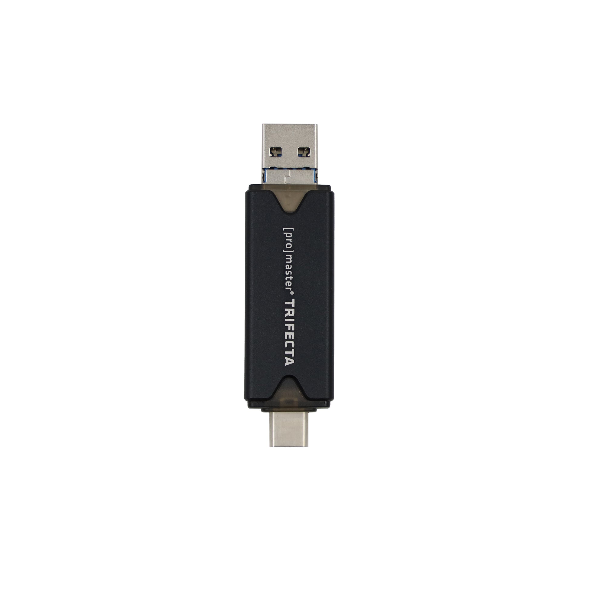 The PROMASTER TRIFECTA CARD READER has 3 types of connections (USB-A, USB-C, & USB Micro B) as well as USB On-The-Go (OTG) technology for broad connectivity with many computers, tablets, and smartphones. Its dual slots accept SD and micro SD cards. It can access them simultaneously, as independent drives, allowing for copying and transferring of files. This reader works at UHS-I BUS speeds and is also compatible with UHS-II type cards.