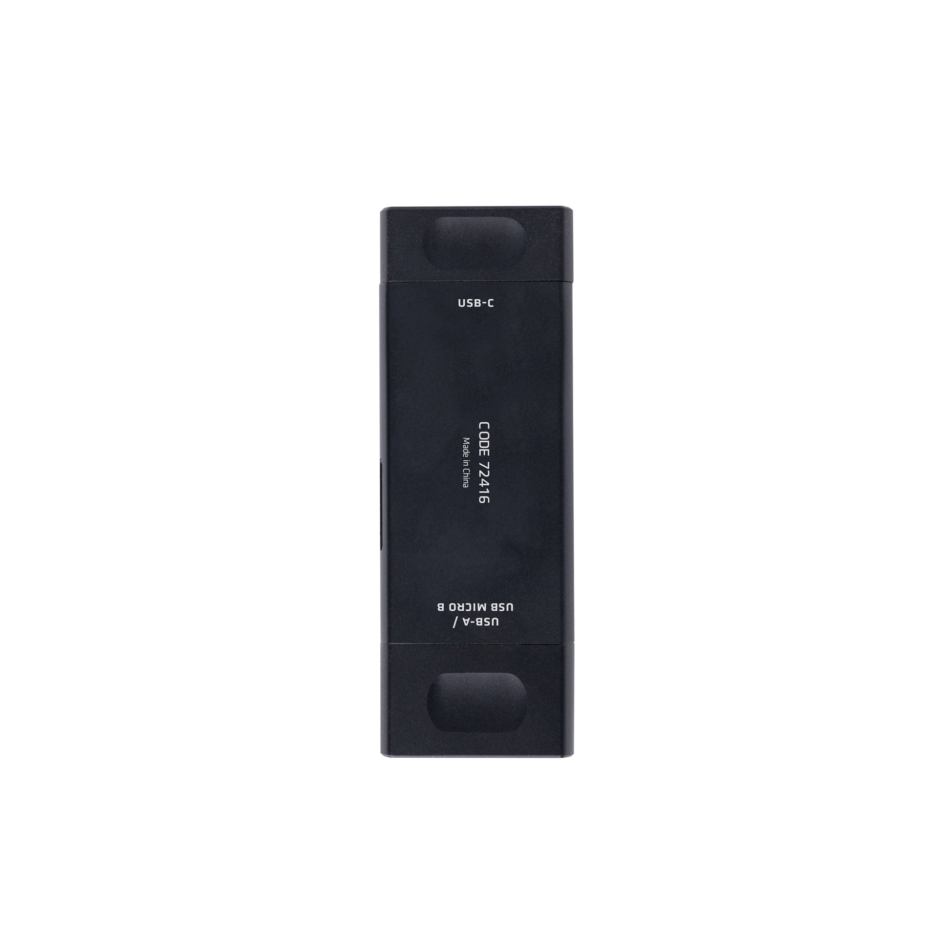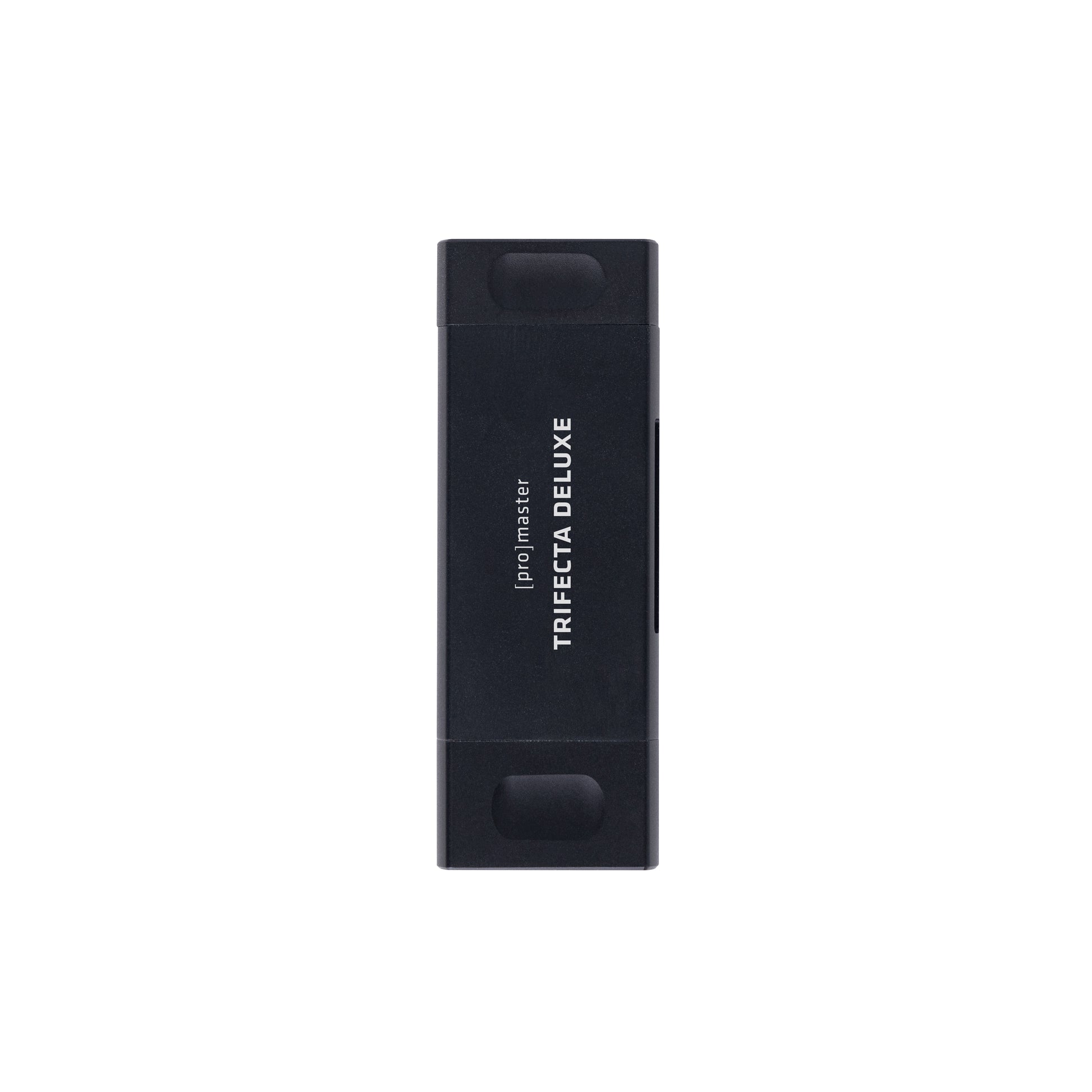 The ProMaster Trifecta Deluxe Card Reader has three types of connections (USB-C, USB-A and USB Micro-B) along with iOS and Android OTG (on-the-go) compatibility for broad connectivity with your computer, tablet, and phone. Its dual slots accept SD and MicroSD cards, and the Trifecta can access them simultaneously as independent drives to allow for easy file transfer and copying. The reader’s UHS-II capability allows for ultra-fast transfer speeds of up to 300MB/s. (UHS-I cards work at UHS-I speeds.) With all this functionality, the Trifecta is less than 3” long and weighs under an ounce, so it’s easy to keep on hand for whenever you need it.