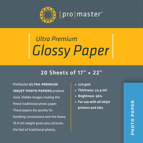 ProMaster's Glossy Photo Inkjet paper is ideal for making photo quality prints on your inkjet printer at home. Enlargements of your favorite images will look and feel just like traditional photos. The micro porus design yields unprecedented image permanence and is fast drying. ProMaster Glossy Photo Inkjet paper has an ultra high gloss finish that shows the sharpness and detail of your photos while giving the feel and permanence of a true photographic print. For prints at home that rival those from a photo lab, choose ProMaster Glossy Photo Inkjet Paper.